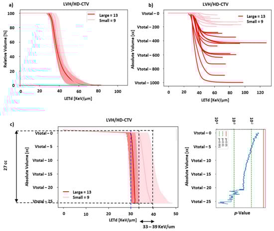 The results of the investigation on DRBE and LETd statistics are presented in Table 1. The average median LETd in HD-CTV for small tumors was 40.2 ± 3.8 keV/µm vs. 38.3 ± 3.2 keV/µm in large tumors. The differences in LETd distribution between small and large tumors is described in the relative-volume LETd volume histogram (LVH) (cumulative LVH, mean ± SD) for HD-CTV (Figure 1a), HD-PTV, and GTV (Figure S1). For this study, the clinical qualitative starting point was that the recurrences may occur partly due to insufficient high-LETd distribution in a significant volume of the tumor. Hence, we further analyzed different regions of the LVH. As seen in Figure 1a, the right-hand part of the LVH showed a moderate-to-high-LETd component concentrated in a very small volume of the HD-CTV in the large tumors. However, a large fraction of the HD-CTV was not covered by high-LETd distribution. Considering the large variation in HD-CTV, evaluating only relative-volume LVH would be suboptimal; hence, we focused on the absolute-volume LVH. In order to evaluate the absolute volume of HD-CTV receiving low-LETd distribution, the left part of the LVH was evaluated. All the HD-CTV volumes were plotted with respect to the largest HD-CTV volume, as described in the methods section (Figure 1b). The difference in LETd distribution between small and large tumors became more prominent on plotting the absolute-volume LVH curves for individual cases. A clear separation is visible between small and large tumor LVHs (Figure 1b). Moreover, a statistically significant difference is demonstrated between the two groups (absolute-volume cumulative LVH representing mean ± SD) for volumes of at least 27 cm3 (low-LETd region), for HD-CTV (Figure 1c), and at least 56 and 9 cm3 for HD-PTV and GTV, respectively (Figure S1). These volumes represent the low-LETd region of the target volumes and must receive the optimal amount of high-LETd distribution. Our analysis suggests that in order to significantly improve high-LETd distribution in the targets in large sarcomas/chordomas, the low-LETd region should not receive LETd < 33 keV/µm (Figure 1c for HD-CTV and Figure S1 for HD-PTV and GTV).
