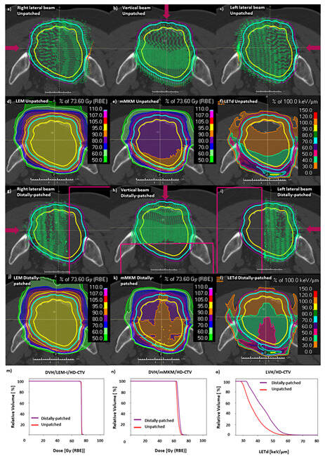 LETd optimization in large pelvic sarcomas/chordomas with LETd optimization using ‘distal patching’. (a–c) Description of unpatched beam design, a conventional 3-field beam design (bilateral and posterior beam) in a representative case of large pelvic sarcoma with spatial distribution of carbon-ion spots (green crosses represent carbon-ion spots, purple arrows represent direction of the beams). (d) DRBE|LEM-I, (e) DRBE|mMKM, and (f) LETd (unpatched) distribution corresponding to Figure 1a–c. The GTV (yellow), HD-CTV (cyan), HD-PTV (purple) were prescribed 73.6 Gy (RBE)/16 fraction. The high-LETd region can be seen at the end of the carbon-ion beam range in unpatched-CIRT plan (f). (g–i) Description of a “distal patching” with spot distribution in 3-field beam design (bilateral and posterior beam) with introduction of distal-patching structures, applied to cone down boost to HD-PTV (7 fractions). (j–l) Images demonstrating the impact of distal patching on the DRBE|LEM-I, DRBE|mMKM distribution and redistribution of LETd (especially, 40 and 50 keV/µm LETd surface in green and magenta, respectively) from periphery of HD-CTV and HD-PTV (f) to the central region of GTV (l). (m–o) DVH and LVH comparison between non-distally patched (red), and distally patched (purple) CIRT plans. Slightly higher mMKM max doses were observed, but they were located inside the target in the distally patched plan. (o) LVH showing significant improvement on LETd distribution in the distally patched CIRT plans. Note: distally-patched data (j–o) represent statistics from unpatched plan for 9 fractions, and from distally-patched plan for 7 fractions.