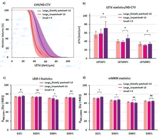 LETd optimization using ‘distal patching’: DRBE|LEM-I, DRBE|mMKM, and LETd statistics and LVH for HD-CTV. (a) Cumulative relative-volume LVH for HD-CTV (mean ± SD) displaying improvement in LETd distribution in large tumors after distal patching. (b) LETd statistics displaying statistically significant improvement in all the LETd parameters, especially LETd98%, where major part of HD-CTV in large tumors receives LETd comparable to small tumors. (c,d) LEM-I and mMKM statistics showing comparable target coverage in small tumors (unpatched), large tumors (unpatched) and large tumors with distally patched plans. Note: statistics is displayed for 10–9 fractions of unpatched + 6–7 fractions of distally patched CIRT plan). *: p < 0.05, NS: p = not significant.
