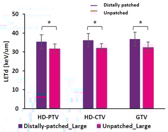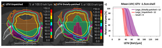 The distal patching method could improve the fraction of GTV, HD-CTV, and HD-PTV receiving high LETd (Figure 2l,o and Figure 3a,b). Moreover, LETd statistics in distally patched plans for large tumors (HD-CTV, HD-PTV, and GTV) were more favorable than those of unpatched plans in large and small tumors (Figure 3b, Figure S2c, S2f, respectively). Overall, distal patching increased the LETdmean in HD-PTV by 7.1 ± 6.5 keV/µm, HD-CTV by 8.5 ± 7.3 keV/µm, and GTV by 10 ± 8.8 keV/µm.