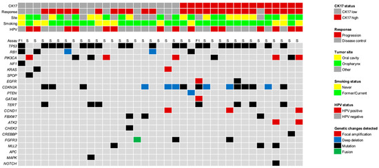 Illustration of somatic events as determined via next-generation sequencing (NGS) of clinically relevant cancer-related genes in the discovery cohort. No apparent correlation with CK17 expression can be observed. Relevant patient and tumor characteristics are presented in the top panel, above the genomic alterations. The color coding is explained in the key on the right. HPV—human papillomavirus, CK17—stress keratin 17, F1—Foundation One, and S—StrataNGS.