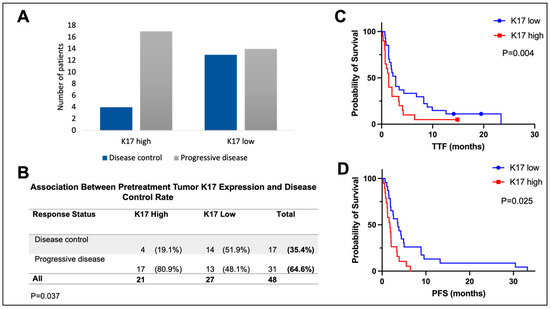 DCR was associated with low CK17 expression status (p = 0.037, Figure 3A,B). In the CK17 high group, 17 (17/21, 81%) patients had progressive disease. In the CK17 low group, 14 (14/28 patients, 52%) had disease control, and 13 (13/28, 48%) patients had progressive disease.