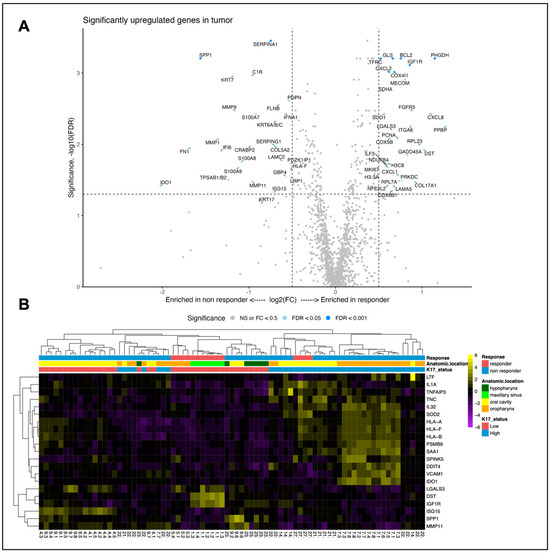 (A): differential gene expression in the tumor compartment (Pan-CK+) between non-responders and responders to pembrolizumab. (B): gene expression heatmap relative to key patient and tumor characteristics.