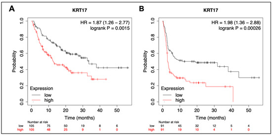 Exploratory pan-cancer analysis using publicly available transcriptomics data from pembrolizumab-treated patients. Kaplan–Meier curves were used to compare the overall survival (A) and progression-free survival (B) in K17 low- vs. high-expressing tumors.