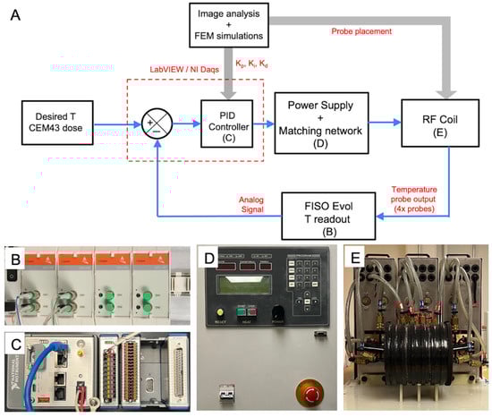For reading temperature (from FISO EVO analog output) and controlling power, a NI CompactRIO (NI cRIO 9042 1.6 GHz quad-core) with the multifunction I/O module (NI9381, with 8 analog inputs and 8 analog outputs) and compatible LabVIEW software interface (National Instruments, Austin, TX, USA) were used. Digital signal processing, error estimation, and conversion of the error signal to the appropriate control signal (0–5 V) for the 120 kW AMF system were performed in LabVIEW. Temperature, power, and CEM43 data were exported from the cRIO controller in TDMS format.