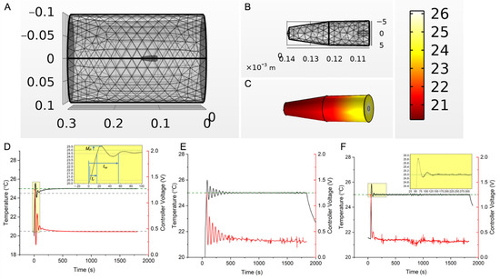 Temperature controller design, simulation, and experimental validation. (A) 3D mesh model of the RF coil and gel + Cu wire experimental setup, used to simulate open-loop and closed-loop temperature vs. time responses as a function of AMF and PID gains, through finite element time domain simulations of coupled electromagnetic and heat-transfer equations in COMSOL Multiphysics. (B) Zoomed in view of the 3D mesh model of the gel + Cu wire setup shown in (A). (C) Snapshot of the temperature distribution in the agarose gel + Cu wire system at 30 min, during a PID feedback-controlled simulation of heat transfer, where the setpoint temperature, , at the probe location (2.3 mm from center) was set to 25 °C. (D) Simulated temperature vs. time responses (black curve) for setup in (C), for input gains ( of (0.26, 0.001, 3). Response curves to different input gains ( in the neighborhood of calculated gain values (0.26, 0.001, 0.11) are shown in Figure S1 (0.26, 0.001, ), where 2 < < 3, was chosen as initial gains (starting with = 3) for the experimental system to ensure a quick rise time. The red curve and right-axis represent controller feedback voltage. A 0–1.25 V range correspond to 0–9.8 kA/m peak AMF amplitude at 160 kHz. Inset shows rise time (tr), settling time (tss), and overshoot (Mp). (E) Experimentally measured temperature vs. time response (black curve) in the agarose gel + Cu wire system, during a 30 min PID temperature-control experiment, where the setpoint temperature, , was input as 25 °C. Initial gains of (0.2, 0.001, 3), similar to the model, were entered, but integral gain, was lowered to lower the effect of integral-windup and consequent power supply tripping from rapid oscillations. Final gains that resulted in a stable compromise between rise time, settling time and minimizing power oscillations, were (0.23, 0.0001, 2.84). The red curve and right-axis represent controller feedback voltage. A 0–1.25 V range correspond to 0–9.8 kA/m peak AMF amplitude at 160 kHz. (F) Experimentally measured temperature vs. time response (black curve) in the “tuned” agarose gel + Cu wire system, during a 30 min PID temperature-control experiment, where the setpoint temperature, , was input as 25 °C and gains of (0.23, 0.0001, 2.84) were used. Inset shows the initial overshoot <5%. Settling time ( ) of 39.7 s and rise time ( ) of 8.35 s were observed, well within the design specifications of the control system ( < 5 min, < 60 s). The red curve and right-axis represent controller feedback voltage. A 0–1.25 V range correspond to 0–9.8 kA/m peak AMF amplitude at 160 kHz. In vitro experiments for validation of controller temperature response were conducted three times (N = 3).