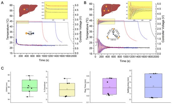 Temperature-controller performance during ex vivo heating experiments in a cow liver lobe, with single standard Cu wire heat source, (A), and a 3-wire distributed heat source configuration, (B). Yellow circle (●) in the liver schematic indicates a Cu wire cross-section, and a star symbol (✶) indicates fiberoptic temperature probe sensor placement. (A) Temperature vs. time (left y-axis), and controller voltage vs. time (right y-axis), responses of the PID controller to setpoint temperatures of 44, 44.5 and 45 °C for treatment times of 30, 22.5 and 15 min, respectively in a cow liver lobe with a single Cu wire heat source. The probe sensor distance from the Cu heat source was 1.5 mm (±10%). Treatment times were chosen to cover a range of 15–30 min, based on clinical safety requirements (e/g. canine patient time under anesthesia <30 min) for MHT treatments. Based on the selected treatment time (15, 22.5 or 30 min), the setpoint temperatures were accordingly adjusted to achieve a target CEM43 of 60 min, i.e., 44 °C for 30 min, 44.5 °C for 22.5 min and 45 °C for 15 min. Three experiments were conducted for the single heat source geometry (N = 3). Within each experiment, a different target temperature setpoint was selected (44 °C for 30 min, 44.5 °C for 22.5 min and 45 °C for 15 min). Inset shows magnified view of the temperature overshoot (<1%) and steady state error (<1%). gains of (0.2, 1 × 10−5, 2.5) were used. (B) Temperature vs. time (left y-axis), and controller voltage vs. time (right y-axis), responses of the PID controller to setpoint temperatures of 44, 44.5 and 45 °C for treatment times of 30, 22.5 and 15 min, respectively in a cow liver lobe with three distributed Cu wire heat sources. The probe sensor is placed within the triangle formed from the Cu wire cross-sections. Distances between Cu wires and between Cu wire and temperature sensor are given in the inset. Treatment times were chosen to cover a range of 15–30 min, based on clinical safety requirements (e.g., canine patient time under anesthesia <30 min) for MHT treatments. Based on the selected treatment time (15, 22.5 or 30 min), the setpoint temperatures were accordingly adjusted to achieve a target CEM43 of 60 min, i.e., 44 °C for 30 min, 44.5 °C for 22.5 min and 45 °C for15 min. Three experiments were conducted for the distributed heat source geometry (N = 3). Within each experiment, a different target temperature setpoint was selected (44 °C for 30 min, 44.5 °C for 22.5 min and 45 °C for 15 min). Inset shows magnified view of the temperature overshoot (<5%) and steady state error (<1%). ( gains of (0.5, 1 × 10−6, 2.5) were used. (C) Box-whisker + scatter plot of controller performance parameters obtained from temperature vs. time data in (A,B). Performance metrics include efficacy in attaining target treatment specifications of cumulative equivalent minutes at 43 °C (CEM43) reported in min, and design specifications of settling time (, rise time ( ) and percentage overshoot ( ). Lower settling times (<1 min) and overshoot (<1%) were observed in the single heat sources case vs. multiple heat sources. (C) Box whisker plots of CEM43 values calculated from measured temperatures.