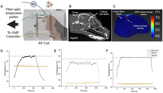 Prior to MHT, fiber optic probes were placed into the infusion port for the MNPs or a catheter port ~5 mm away from the infusion port, as well as subcutaneous tissue in the head and the rectum (Figure 4A). Probes in the catheter ports were used for MHT feedback control. Subcutaneous and rectal probes were used as additional safety probes to limit tissue surface and core temperature heating to 45 °C and 40 °C, respectively.