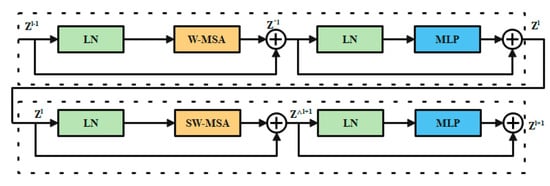 In place of the standard multi-head self-attention (MSA) module, the swin transformer block [41] is constructed using shifted windows. Identical transformer pairs, as depicted in Figure 4. Each swin transformer block consists of LayerNorm (LN) layers, multi-head self-attention modules, residual connections, and two-layer MLPs with GELU non-linearity. A shifted window-based multi-head self-attention (SW-MSA) module is used in the first transformer block, while a window-based multi-head self-attention (W-MSA) module is used in the second. Continuous swin transformer blocks are created using this type of window partitioning (10)–(13):