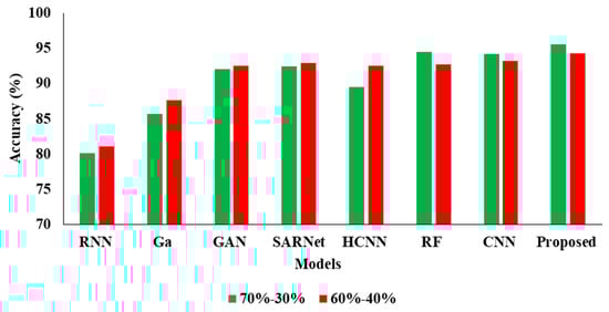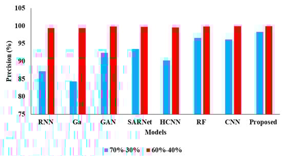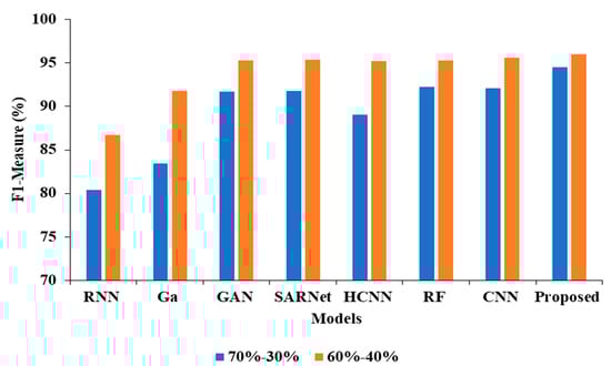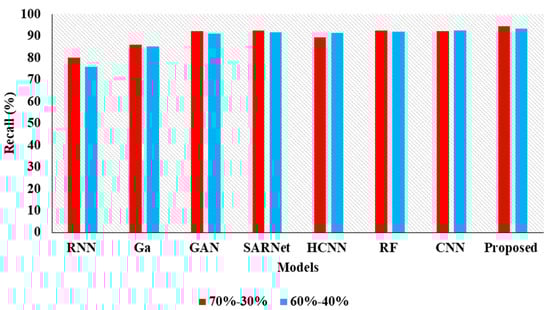 In the Table 4, the results represent the Comparative Analysis of the Proposed Model. In these evaluations, the proposed model data is split into 60–40% percentages, and the performance achieves better performance than other models. For instance, the proposed model has an accuracy of 94.32% and a recall of 93.24%, respectively. Here, data plays a major role in the performance analysis, which is clearly proven in Figure 5, Figure 6, Figure 7 and Figure 8.