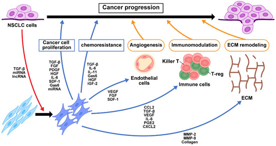The tumor microenvironment comprises different types of stromal cells, including vascular lymphatic networks, fibroblastic cells, inflammatory immune cells, mesenchymal stem cells (MSCs), and extracellular matrix (ECM). These represent key components in tumor progression, and stromal components have been speculated to be functionally organized to promote cancer cell survival, promoting aggressive neoplastic phenotypes and the acquisition of drug resistance [4,5]. A specific subset of stromal cells, termed cancer-associated fibroblasts (CAFs), constitutes a major stromal component [6]. CAFs were initially described as myofibroblasts that are distinct from normal fibroblasts because of their expression of α-smooth muscle actin (α-SMA) and are also shown to synthesize important amounts of collagen and other ECM components [7]. Recently, CAFs have been speculated to have important functions in epithelial solid tumor biology, such as neoplastic progression, tumor growth, and metastasis, via secretion of factors that promote tumorigenesis by stimulating angiogenesis, cancer cell proliferation, and invasion, in addition to recruiting macrophages and suppressing T-cell antitumor immunity [6,8]. CAFs are genetically stable and influence tumor progression and sensitivity to antitumor therapy through the secretion of ECM, cytokines, and growth factors. Recently, many reports have shown that CAFs can modulate the immune system via paracrine signaling, juxtacrine interactions, and ECM remodeling [9,10,11]. In NSCLC, CAFs have been implicated in enhanced stemness; migration; tumor growth; and resistance to chemotherapy, radiotherapy, tyrosine kinase inhibitors (TKIs), and immunotherapy [12,13,14,15]. Therapeutic targeting of CAFs in the NSCLC tumor microenvironment thus represents an intriguing possibility for improving outcomes in NSCLC patients.