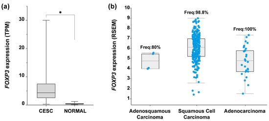 FOXP3 expression levels in cervical cancer. (a) Comparison of FOXP3 expression levels in transcript per million (TPM) from cervical epithelial squamous carcinoma (CESC) samples (n = 304, avg = 5.7, median = 4.3) vs. normal tissue (NORMAL) (n = 22, avg = 0.4, median = 1), Log2(Fold Change) = 2.1; (b) FOXP3 expression abundance in RNA Seq by expectation-maximization (RSEM) from TCGA-CESC data; RSEM values are expressed as RNA Seq V2 RSEM (Log2(value + 1)). Each blue dot represents a patient sample positive for FOXP3 expression: adenosquamous carcinoma, n = 4 of 5 (frequency = 80%), squamous cell carcinoma, n = 253 of 256 (frequency = 98.8%), adenocarcinoma, n = 27 of 27 (frequency = 100%); TCGA-CESC, n = 308 patients. (*) depicts statistical significance with a p-value < 0.05.