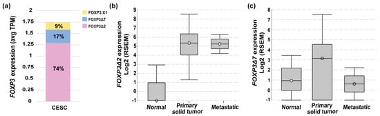 To deepen into the FOXP3 mRNAs isoforms expressed in cervical cancer, data from TCGA-CESC was analyzed in ISOexpresso (http://wiki.tgilab.org/ISOexpresso/ accessed on 10 October 2022) [53] and TSVdb (http://tsvdb.com/ accessed on 10 October 2022) [54] web-based platforms. Results obtained from the analyses showed that tumor samples express three variants with a differential frequency, FOXP3Δ2 with a frequency of 74%, FOXP3Δ7 with 17%, and FOXP3 X1 with 9% (Figure 2a). TSVdb results showed that the most frequent variant, FOXP3Δ2, was expressed with a high difference between normal and metastatic tissue (Figure 2b). The FOXP3Δ7 variant was observed with slightly increased expression in primary solid tumors, but no difference was observed for normal and metastatic samples (Figure 2c). Unfortunately, the FOXP3Δ2Δ7 variant is not included in these databases. Therefore, no information related to this isoform was available in either database.