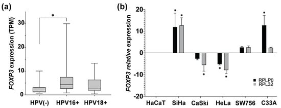 FOXP3 expression levels in cervical cancer samples and cervical cancer-derived cell lines. (a) Comparison of FOXP3 expression levels in transcript per million (TPM), from CC samples HPV16+ and HPV18+ vs. HPV(-) CC samples; (b) detection of FOXP3 relative expression levels by qPCR in CC-derived cell lines HPV16+ (SiHa and CaSki), HPV18+ (HeLa and SW756), and HPV(-) (C33A); RPLP0 and RPL32 were used as reference genes. The expression of FOXP3 in HaCaT cells was used as a calibrator. (*) depicts statistical significance with a p-value < 0.05.