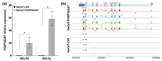 Validation of the establishment of the FOXP3Δ2Δ7 exogenous expression model. (a) FOXP3Δ2Δ7 relative expression levels were detected in the cell model by qPCR; RPLP0 and RPL32 were used as reference genes. The expression of FOXP3 in HaCaT-LVX was used as a calibrator to calculate the relative expression; (b) Sashimi plot of the RNAseq assays from replicates of HaCaT-FOXP3Δ2Δ7 and HaCaT-LVX cell lines, reads covering the FOXP3 genomic region are shown as colored peaks, and each numbered curved line represents an interexonic junction with the detection level. Upper blue boxes and connecting blue lines represent exonic and intronic regions. (*) depicts statistical significance with a p-value < 0.05.