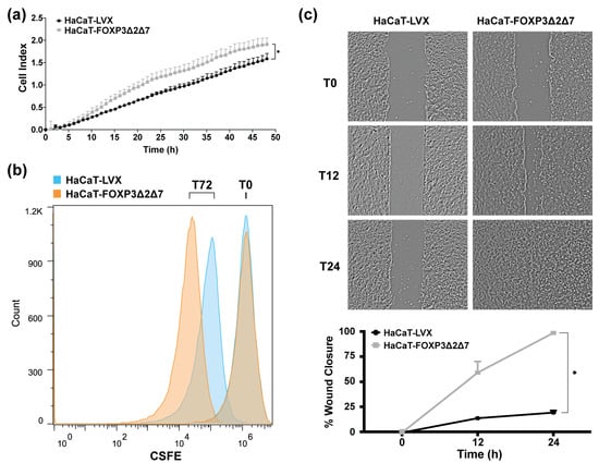 Evaluation of biological effects by FOXP3Δ2Δ7 exogenous expression in vitro. (a) Real-time cell proliferation analysis with xCELLigence RTCA platform for 48 h; values are expressed as cell index; (b) cell division tracking with CSFE reagent, fluorescence measurement was achieved with flow cytometry at the initial time point and 72 h later; (c) depictive images of wound healing assay and plot of wound closure percentage during 24 h; photographs were acquired at 4× amplification and processed with ImageJ software. (*) depicts statistical significance with a p-value < 0.05.