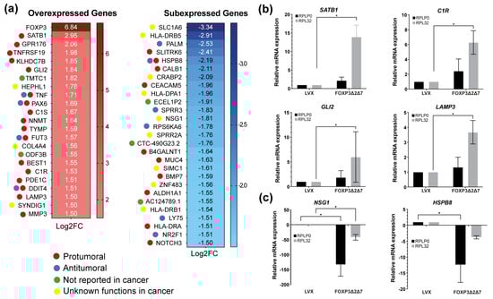 Identification of differentially expressed genes by FOXP3Δ2Δ7 exogenous expression. (a) Differentially expressed genes heatmap selected by −1.5 ≤ Log2(fold change) ≥ 1.5, p-value < 0.05; code color indicates a review of what has been previously published about that gene; (b) relative mRNA expression of upregulated genes by qPCR; RPLP0 and RPL32 were used as reference genes; (c) relative mRNA expression of downregulated genes by qPCR; RPLP0 and RPL32 were used as reference genes. (*) depicts statistical significance with a p-value < 0.05.