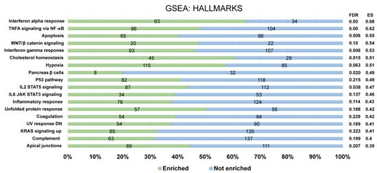 Identification of enriched biological pathways modulated by FOXP3Δ2Δ7 exogenous expression. Enrichment analysis from the Hallmark gene set collection was assessed by GSEA software. The left panel depicts the standard names of the statistically significant pathways, and the right panel shows the false discovery rate (FDR) and enrichment score (ES) values. The numerals at the bar plot indicate the number of enriched (green) and not enriched (blue) genes within each pathway. FDR < 0.25 was established as a selection criterion. A percentage scale is shown at the bottom for better visualization.