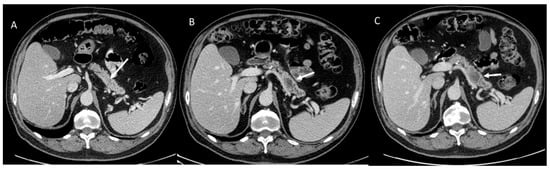 CT evaluation in melanoma patient with FAMM. In (A), arrow shows non-detectable lesion. In (B) arrow shows PDAC after 1 years (respect to CT assessment of (A)) and in (C) after 3 months (respect to CT assessment of (B)).