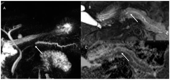 MR/MRCP assessment of Peutz–Jeghers syndrome patient. In MRCP (A), the arrow shows black sign and the dilatation of the main and secondary branch ducts. In T2-W sequences the (B) arrow shows hyperintense tissue and in ADC map (C) hypointense tissue.