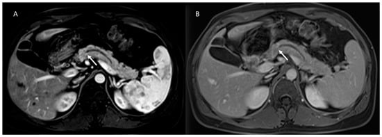 The same patient as in Figure 2; post-contrast MRI evaluation. In arterial (A) and portal (B) phase of contrast study, arrows show no tissue but dilatation of the main and secondary branch ducts.