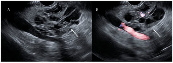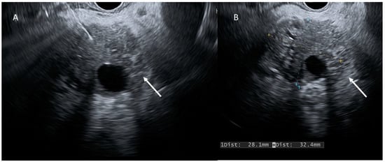 EUS evaluation (A,B); cystic lesion (arrows) appears as a heterogeneous hypo-isoechoic mass.