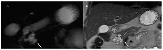 Abbreviated MRI assessment (MRCP: (A) and T2-W: (B) sequences) of pancreatic cistoadenoma, which is characterized by multicyclic lesions (arrow).