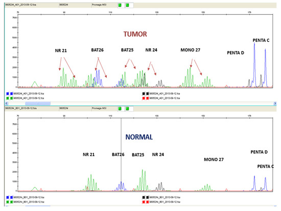 Electropherogram using the pentaplex panel comparing normal tissue samples (bottom panel) with tumor tissue samples (top panel) of the same patient. The additional peaks present on the top panel are a result of MSI. Red arrows indicate microsatellite instability.