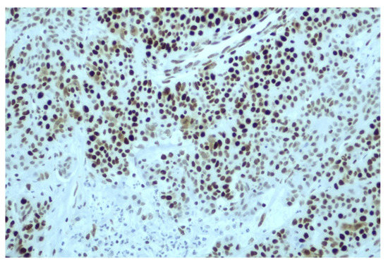 The immuno-histochemical staining of MLH1/MSH2/MSH6 and PMS2 MMR proteins was performed in 230 patients by Ultravision Quanto Detection System HRP DAB (Thermo Scientific, Waltham, MA, USA) and the DAB Quanto (Thermo Scientific, Cheshire WA7 1TA, UK). Briefly, 3 μm sections cut from the formalin-fixed, paraffin-embedded (FFPE) tumor tissue blocks were stained with monoclonal antibodies to MLH1 (Clone: ES05 Agilent Dako, Santa Clara, CA, USA), MSH2 (Clone FE 11 Agilent Dako), MSH6 (Clone: EP49 Agilent Dako), and PMS2 (Clone: EP51 Agilent Dako). The evaluation of the immuno-histochemical expression of the four proteins was performed by a specialized pathologist in the Department of Pathology, University General Hospital of Heraklion. MMR protein immuno-histochemical expression was considered positive when located in the nucleus. In all cases, a positive control of colorectal carcinoma MMR-stable, confirmed by PCR, as well in some cases, an internal positive control (lymphocytes, epithelial cells of colonic crypts), was used. Nuclear staining in all cell types was considered a positive stain. As negative control slides were used from FFPE colorectal cancer tissues, MMR-stable with the primary antibody was omitted. Additionally, an internal positive control (lymphocytes and colonic crypts) was also used. FFPE tumor sections with no primary antibodies were used as the negative control. pMMR protein expression is highlighted by unequivocal nuclear staining in the tumor cells, as previously described [19] when the internal positive controls (lymphocytes, fibroblasts, or normal enterocytes in the vicinity of the tumor) showed positive nuclear staining. In contrast, the tumor was categorized as having dMMR when the nuclear staining of tumor cells was absent (Figure 1) for one or more of the MMR proteins, despite immunoreactivity in the internal positive controls. When internal controls failed, the samples were excluded from the study.