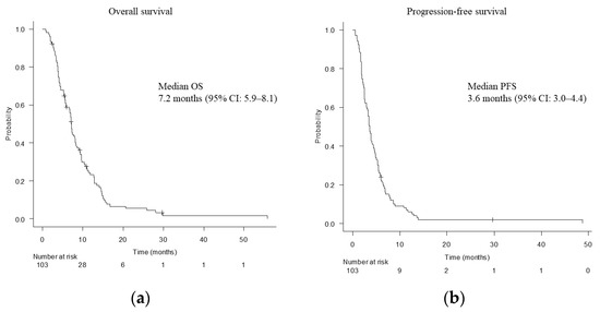 The median follow-up period was 7.2 (range: 0.9–56.6) months. Median OS was 7.2 months (95% CI, 5.9–8.1 months) (Figure 1a). Median PFS was 3.6 months (95% CI, 3.0–4.4 months) (Figure 1b). The ORR and DCR were 7.8% and 63.1%, respectively (Table 3). CA19-9 reduction rate exceeded 50% in 40 patients (38.8%).