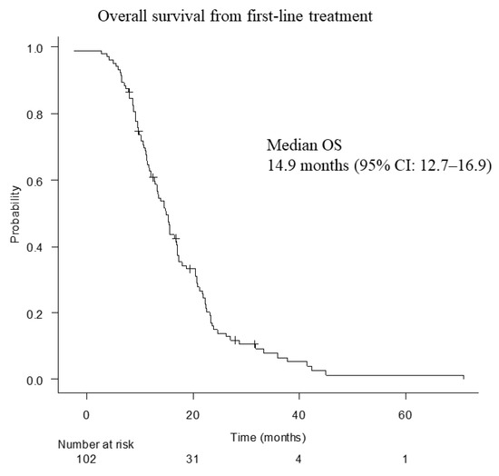 Median OS from the start of first-line mFFX was 14.9 months (12.7–16.9 months) (Figure 2).