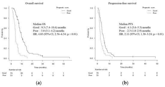Univariate and multivariate analyses of factors affecting OS before the start of second-line chemotherapy are shown in Table 4. Multivariate analysis showed that PS = 0, mGPS = 0, and NLR ≤ 3 were independent prognostic factors. A prognostic index was created which assigns one point to each of the above variables. Patients with a score of 2 or 3 were included in the good prognosis group (n = 70), while those with a score of 0 or 1 were included in the poor prognosis group (n = 33). Median OS was longer in the good prognosis group (9.3 months; 95% CI, 7.4–10.6 months) than in the poor prognosis group (3.8 months; 95% CI, 3.1–4.2 months) (HR, 4.03; 95% CI, 2.56–6.34; p < 0.01) (Figure 3a). Median PFS was 4.1 months (95% CI, 3.6–5.3 months) in the good prognosis group and 2.3 months (95% CI, 1.8–2.9 months) in the poor prognosis group (HR, 2.11; 95% CI, 1.38–3.24; p < 0.01) (Figure 3b).