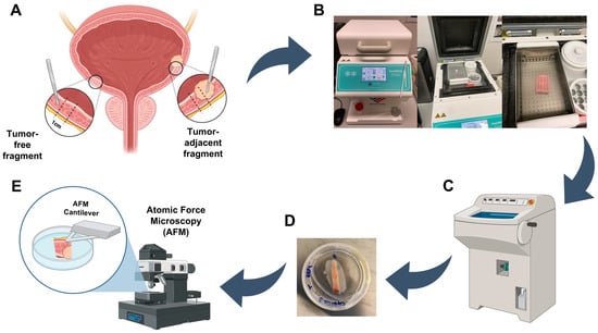 Tissue samples preparation for atomic force microscopy analysis. (A) Bladder tissue excision of tumor-adjacent and tumor-free fragments. (B) Tissue fragments storage at −80 °C until AFM usage. (C) Tissue fragments thinning and preparation for AFM. (D) Sample glued in a tissue culture dish. (E) Sample immersed in PBS ready for AFM measurements. Created with BioRender.com.