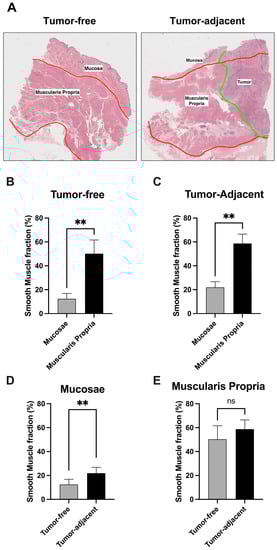 (A) Hematoxylin and eosin (H&E) staining of the tumor-free and tumor-adjacent bladder tissue specimens. (B,C) Comparison of smooth muscle fraction between tumor-free and tumor-adjacent tissue samples. (D,E) Comparison of smooth muscle fraction between mucosae and muscularis propria bladder layers. ** p < 0.001, ns: non-significant.