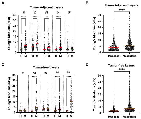 (A,C) Comparison between bladder wall layers (mucosae (U) vs. muscularis propria (M)) Young’s moduli for each patient according to differently located tissue samples (tumor-adjacent or tumor-free). (B,D) Mean Young’s moduli of all mucosae vs. muscularis propria measurements according to differently located tissue samples. ** p < 0.001, **** p < 0.0001.