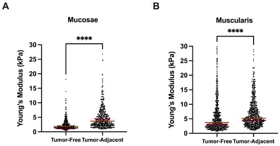 Both mucosa and muscularis propria stiffness was increased in tumor-adjacent tissues. The mucosa had a significantly higher Young’s modulus in tumor-adjacent tissues than in tumor-free tissues (p **** < 1 × 10−4, Figure 4A). Likewise, the muscularis propria had a significantly higher Young’s modulus in tumor-adjacent tissues than in tumor-free tissues (p **** < 1 × 10−4, Figure 4B).
