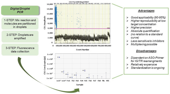 These data demonstrated that in ALL, ddPCR is an extremely accurate tool when the RQ-PCR quantitative range is inferior to 10−4 thanks to its greater amplification efficiency and reproducibility. Moreover, the combined use of new technologies could better discriminate low positive samples that the standard method fails to detect or quantify the disease level [68].