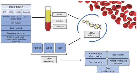 The study of cell-free DNA (cfDNA) and other PB components (known as “liquid biopsies”) is promising and has been investigated, especially in solid tumors [110]. A “liquid biopsy” can define the molecular profile of a tumor by analyzing PB using different methods: cell-free circulating nucleic acids (DNAs, mRNAs, micro-RNAs, or noncoding RNAs), circulating tumor cells (CTCs), or exosomes [111] (Figure 3).