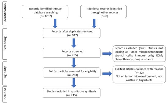 We retrieved relevant published manuscripts via an electronic search on Embase, Scopus, PubMed and Web of Science using keywords including tumor microenvironment; stromal cells; immune cells; extracellular matrix (ECM); cancer hallmarks; hypoxia; chemotherapy; multi-drug resistance and targeted therapy. This search yielded a rich source of data on the role of tumor microenvironment in tumorigenesis and therapy resistance (Figure 1). We removed duplicate articles and only full articles were included in compiling this review.