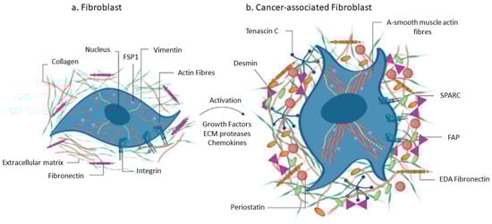Reports have shown that resident and recruited fibroblasts are part of the TME, where they contribute during tumorigenesis and in drug resistance [3,4,5,7,12,17,19,20]. Initially, fibroblasts are anti-tumorigenic as they are involved in the synthesis of the ECM, which surrounds and isolates tumor cells from normal tissue during the early stages of tumorigenesis [5,6,22]. Over time, a subpopulation of activated fibroblasts, referred to as cancer associated fibroblasts, obtain a myofibroblastic phenotype characterized by the increased synthesis of ECM and the release of pro-tumorigenic factors (Figure 3) [6,23]. Similar to myofibroblasts linked to fibrosis, the CAFs are perpetually activated and promote tumorigenesis via the release of factors, the activation of pro-tumorigenic signaling, angiogenesis, microRNA, and cytokines [24,25,26,27,28]. At each stage of tumorigenesis, CAFs continue to produce and interact with various TME components including the ECM, cytokines, and growth factors.
