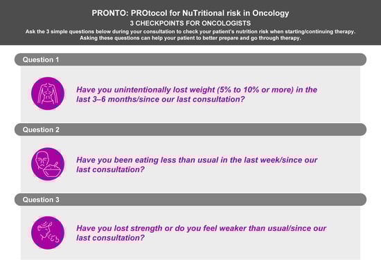 Muscaritoli, M.; Bar-Sela, G.; Battisti, N.M.L.; Belev, B.; Contreras-Martínez, J.; Cortesi, E.; de Brito-Ashurst, I.; Prado, C.M.; Ravasco, P.; Yalcin, S. Oncology-Led Early Identification of Nutritional Risk: A Pragmatic, Evidence-Based Protocol (PRONTO). Cancers 2023, 15, 380. https://doi.org/10.3390/cancers15020380