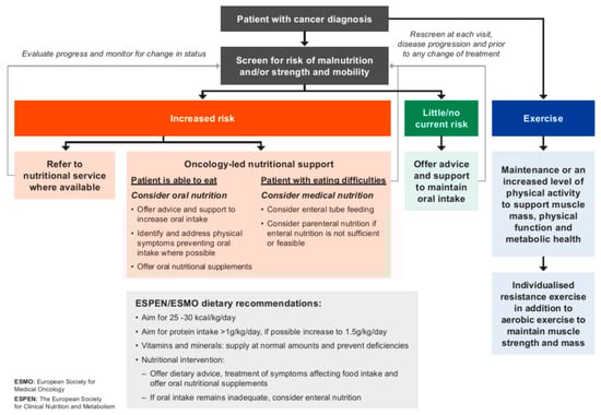 - Muscaritoli, M.; Arends, J.; Bachmann, P.; Baracos, V.; Barthelemy, N.; Bertz, H.; Bozzetti, F.; Hütterer, E.; Isenring, E.; Kaasa, S.; et al. ESPEN practical guideline: Clinical Nutrition in cancer. Clin. Nutr. 2021, 40, 2898–2913. [Google Scholar] [CrossRef] [PubMed]