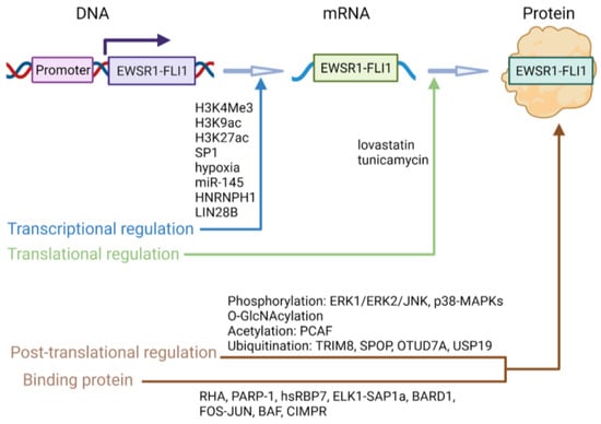EWSR1::FLI1 is also regulated post-translationally (Figure 2). This includes regulation of the physical properties of EWSR1-FLI1 protein by various post-translational modifications that regulate protein function in an acute and spatial manner, as well as various binding proteins that either facilitate or suppress EWSR1::FLI1 function on chromatin.