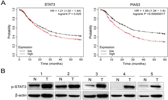 We next focused on the relationship between STAT3 and PIAS, as well as the five-year survival rate of patients with gastric cancer. Using the Kaplan–Meier Plotter databases, we observed that low STAT3 mRNA levels were positively correlated with five-year overall survival (OS; p = 0.029). In addition, low PIAS3 mRNA levels were positively correlated with five-year OS (p = 0.00000017) (Figure 3A).