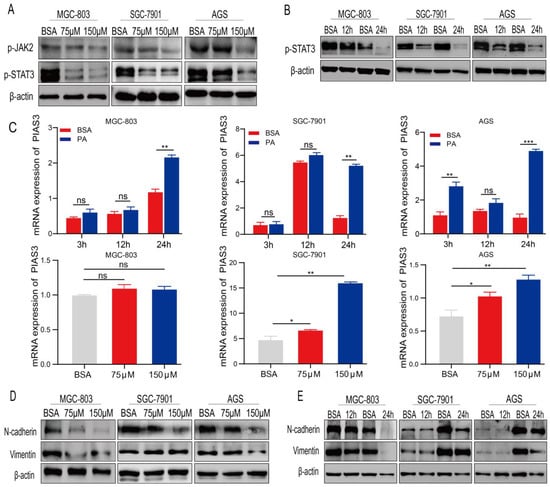 Abnormal STAT3 activation can play a critical role in cancer development by influencing the epithelial–mesenchymal transition (EMT) [26]. Accordingly, we evaluated the levels of EMT-related proteins in the gastric cancer cells after PA treatment. The WB analyses indicated that the levels of N-cadherin and vimentin were lower in the PA-treated human gastric cancer cells than in the BSA-treated cells, and the decreases occurred after treatment with 75–150 μM of PA for 24 h (Figure 4D) or 150 μM of PA for 12–24 h (Figure 4E).