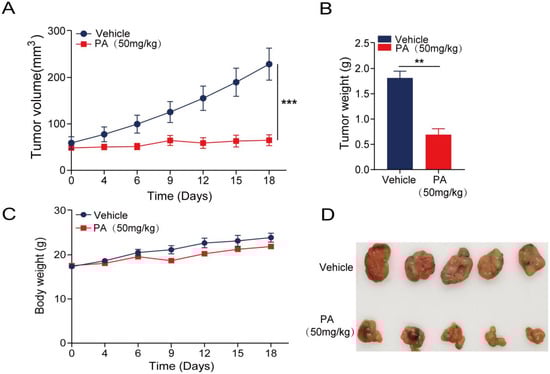 To monitor the anticancer activity of PA in vivo, SGC-7901 cells were used to establish a xenograft model in nude mice. Cancer growth was 54.3% lower after treatment with 50 mg/kg of PA than in the control group, suggesting that PA effectively inhibits cancer growth (Figure 6A,B). Furthermore, no significant differences are observed in the body weight curve (Figure 6C), indicating that PA has a low toxicity. The treatment with 50 mg/kg of PA significantly inhibited the tumorigenicity of SGC-7901 cells in nude mice (Figure 6D).