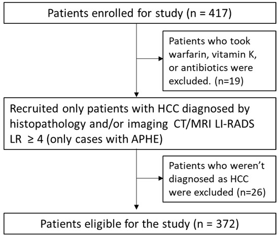 Flowchart of patient selection. Initially, 417 patients with HCC were enrolled, but 19 were excluded for taking warfarin or antibiotics. Only patients with HCC that was diagnosed by histopathology and/or imaging were selected, and 26 patients were excluded. Finally, 372 patients were selected for this study. LI-RADS, Liver Imaging Reporting and Data System; APHE, arterial phase hyperenhancement.
