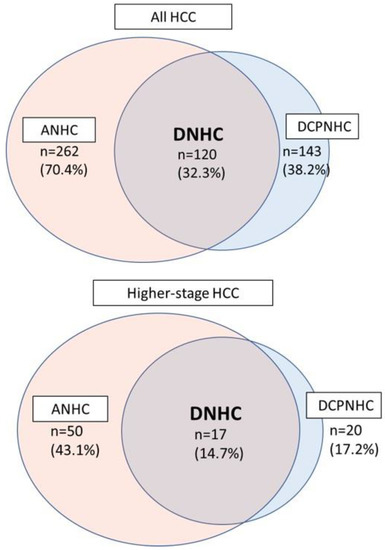 HCC tumor marker negativity. Of all the patients with HCC (n = 372), 262 (70.4%) were ANHC, and 143 (38.2%) were DCPNHC. DNHC included 120 patients (32.3%). In higher-stage HCC patients (n = 116), 50 patients (43.1%) were ANHC, 20 patients (17.2%) were DCPNHC, and 17 patients (14.7%) were DNHC.