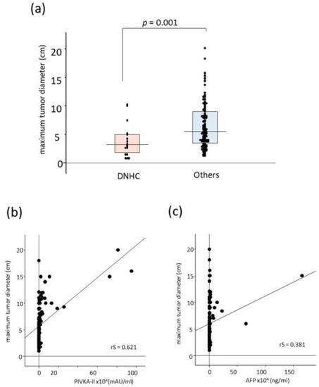The difference in the maximum tumor diameter and correlation with tumor markers in higher-stage HCCs. (a) The median maximum tumor diameter of DNHC was smaller than the other tumors [3.2 (1.8–5.0) vs. 5.5 (3.5–9.0) cm, respectively, p = 0.001]. Tumor size was moderately correlated with (b) DCP levels (rS = 0.621) rather than (c) AFP (rS = 0.381). AFP, alpha-fetoprotein; DCP, des-gamma-carboxyprothrombin; DNHC, double negative HCC; HCC, hepatocellular carcinoma.