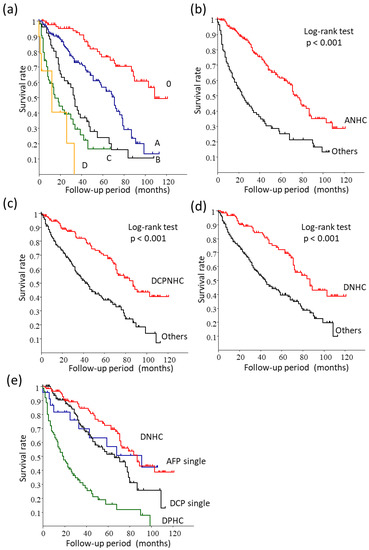 Survival analysis. (a) BCLC staging for all patients. It was well stratified (inter-group statistical differences are p < 0.001, except for B vs. C; p = 0.022, B vs. C; p = 0.028, B vs. D; p = 0.005, and C vs. D; n.s.). (b) Comparison between ANHC and the other patient groups. The survival rate of the patients with ANHC was significantly better than the other patients (p < 0.001). (c) Comparison of DPCNHC and the other patient groups. The survival rate of the patients with DCPNHC was significantly better than the other patients (p < 0.001). (d) Comparison between DNHC and the other patients. The survival rate of the patients with DNHC was significantly better than the other patients (p < 0.001). (e) There was no difference between DNHC and AFP single-positive cases. DNHC cases demonstrated a substantially better prognosis than DCP single-positive cases (p < 0.001) and DPHC cases (p < 0.001).